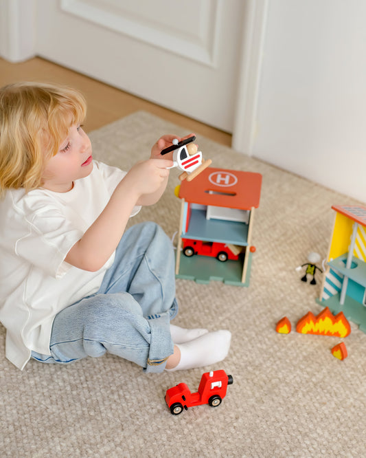 Ahşap İtfaiye İstasyonu ve Garaj Seti - Araçlı & Figürlü (13 Parça)
