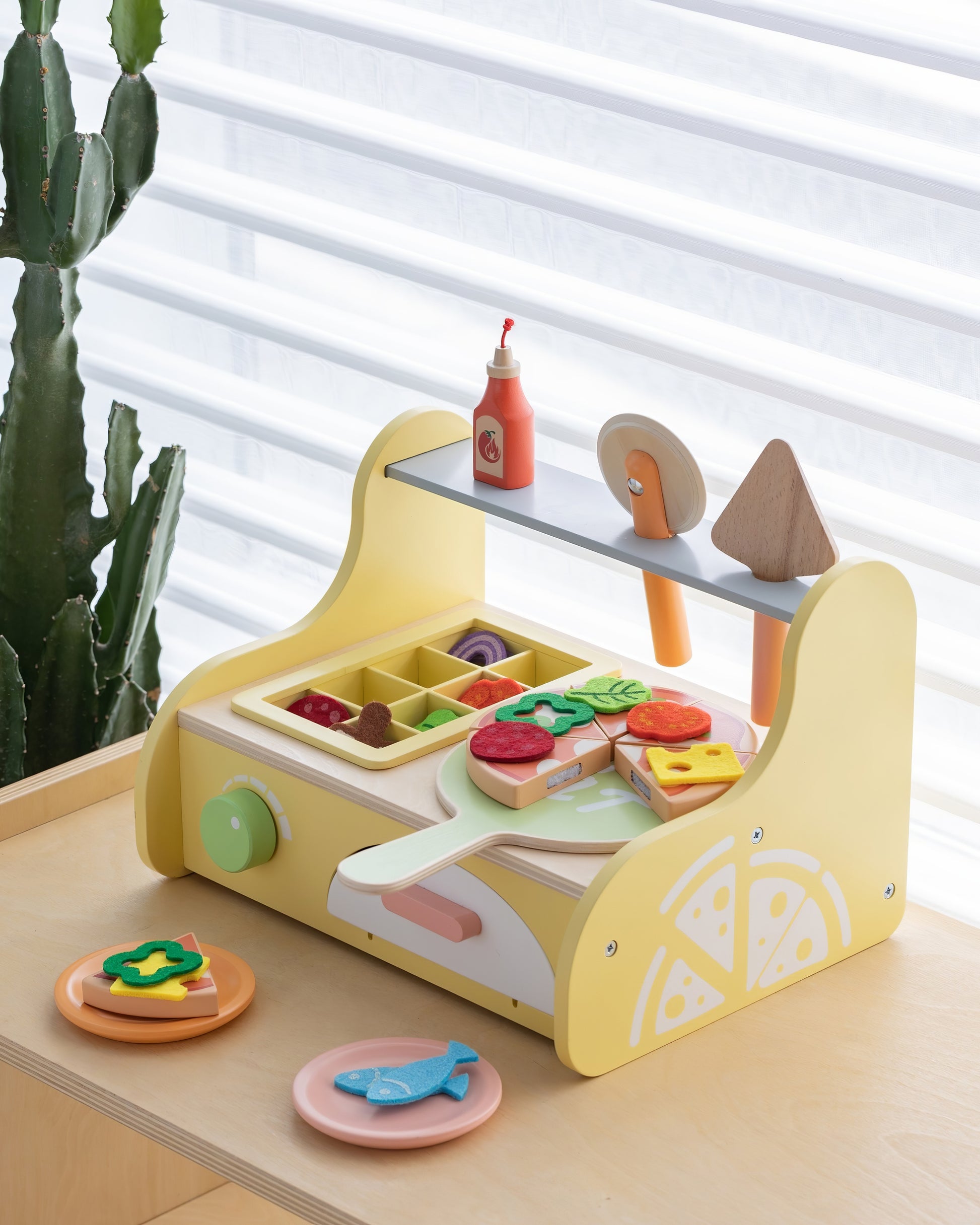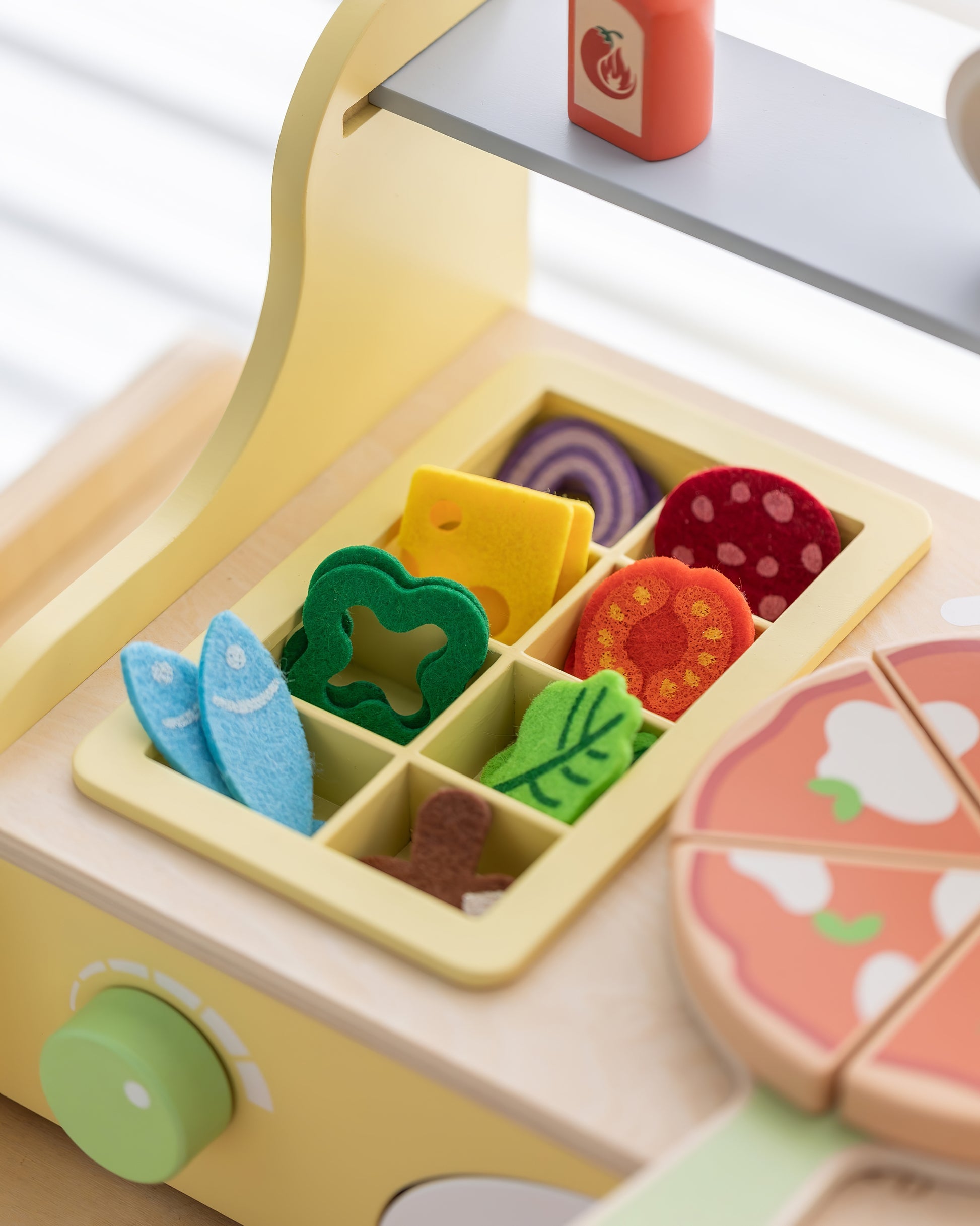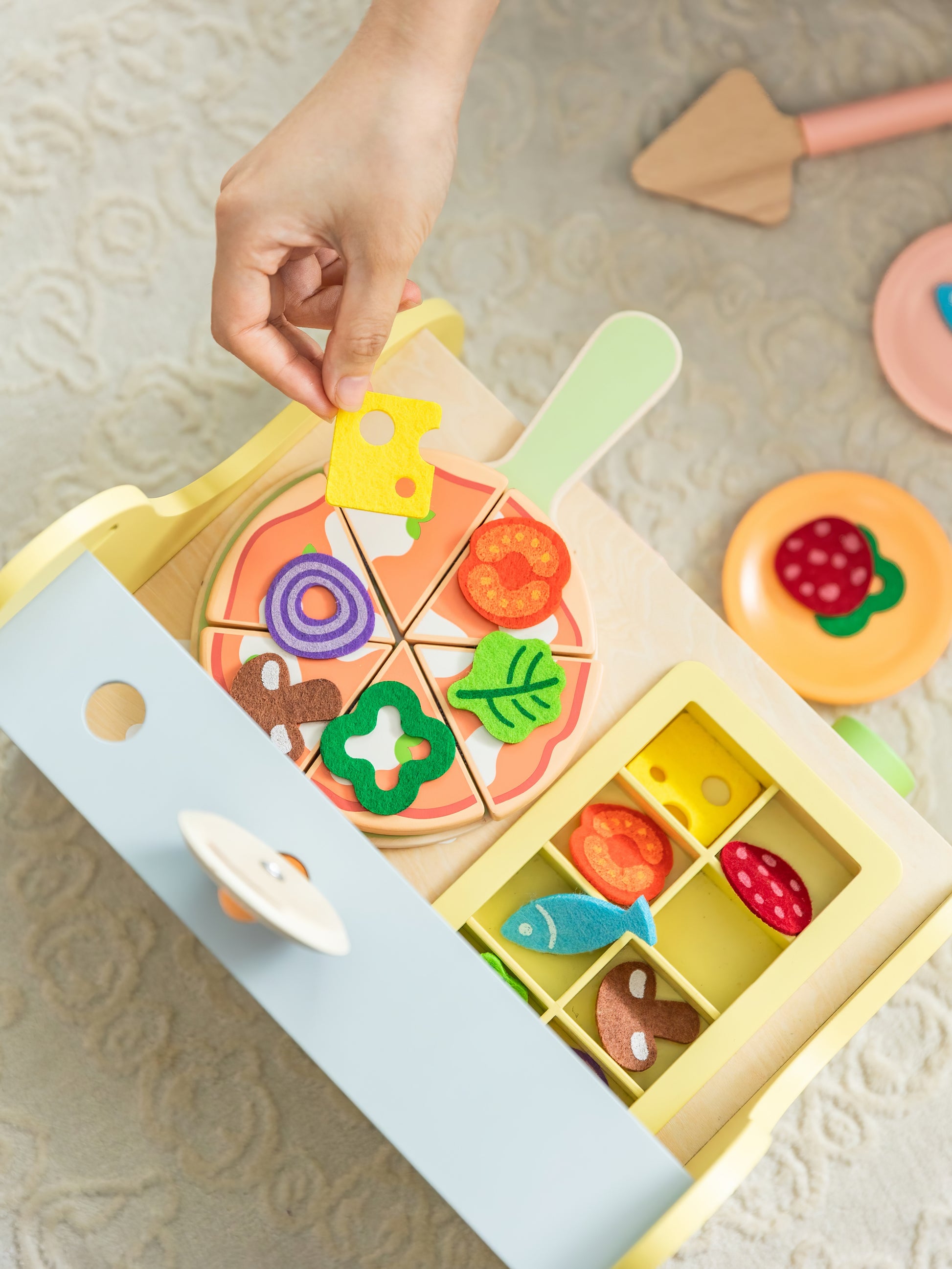 - Yaratıcı Süsleme: Peynir ve soğan gibi keçe malzemeler sayesinde çocuklar pizzalarını diledikleri gibi süsler.
