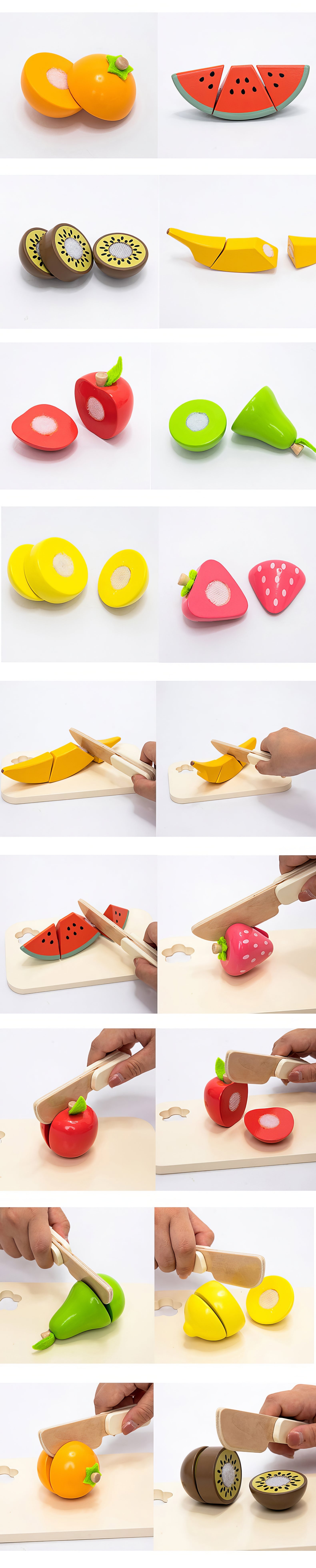 - Her bir meyve parçası doğal ahşaptan üretilmiş ve cırt cırtlı yapısıyla tekrar tekrar kesme oynanabilirliği sunar.