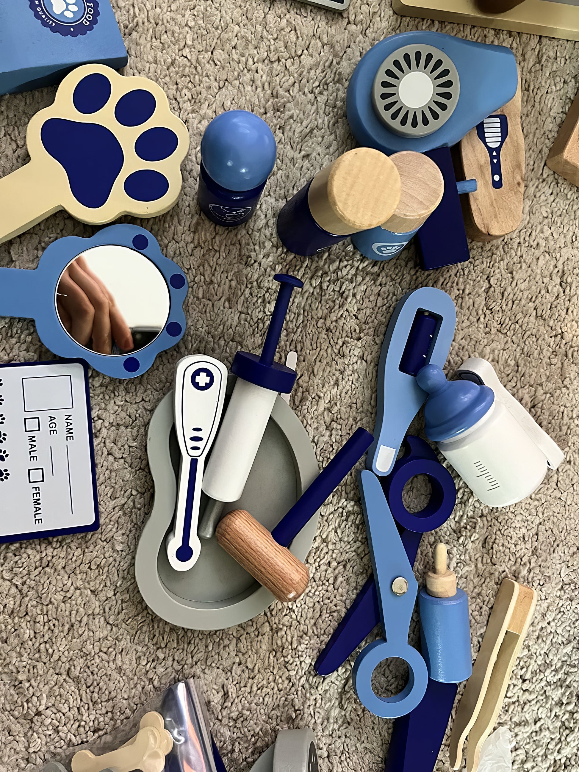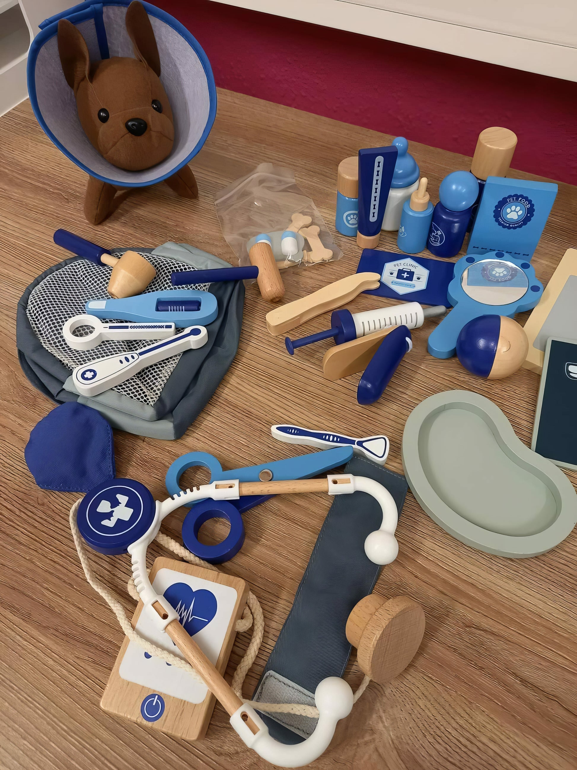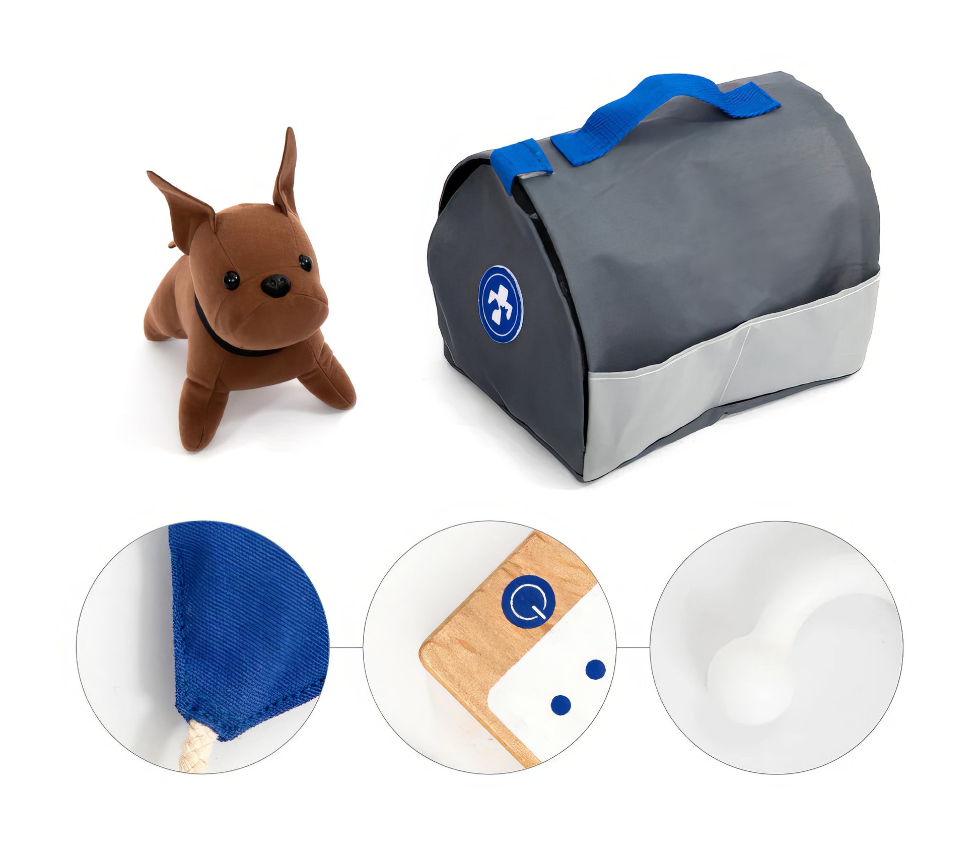 Montessori Ahşap Veteriner Oyuncak Seti – 37 Parça Mavi Taşıma Çantalı