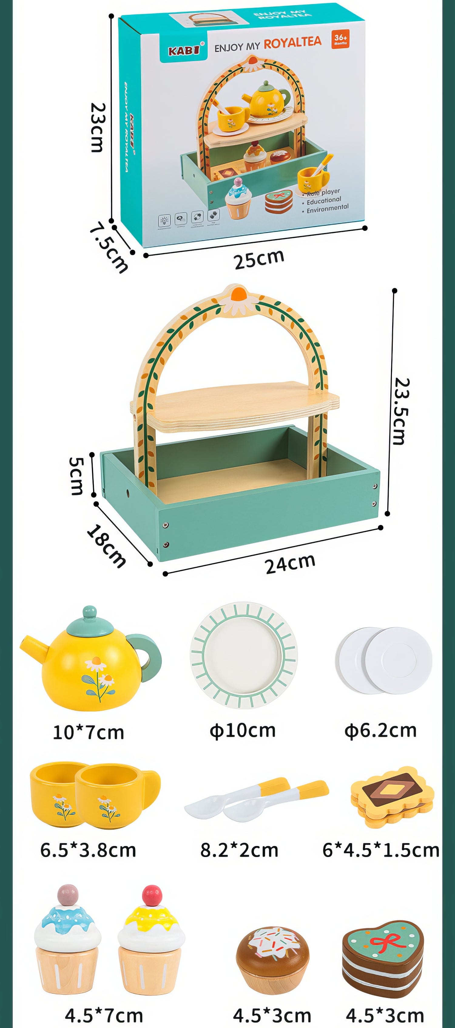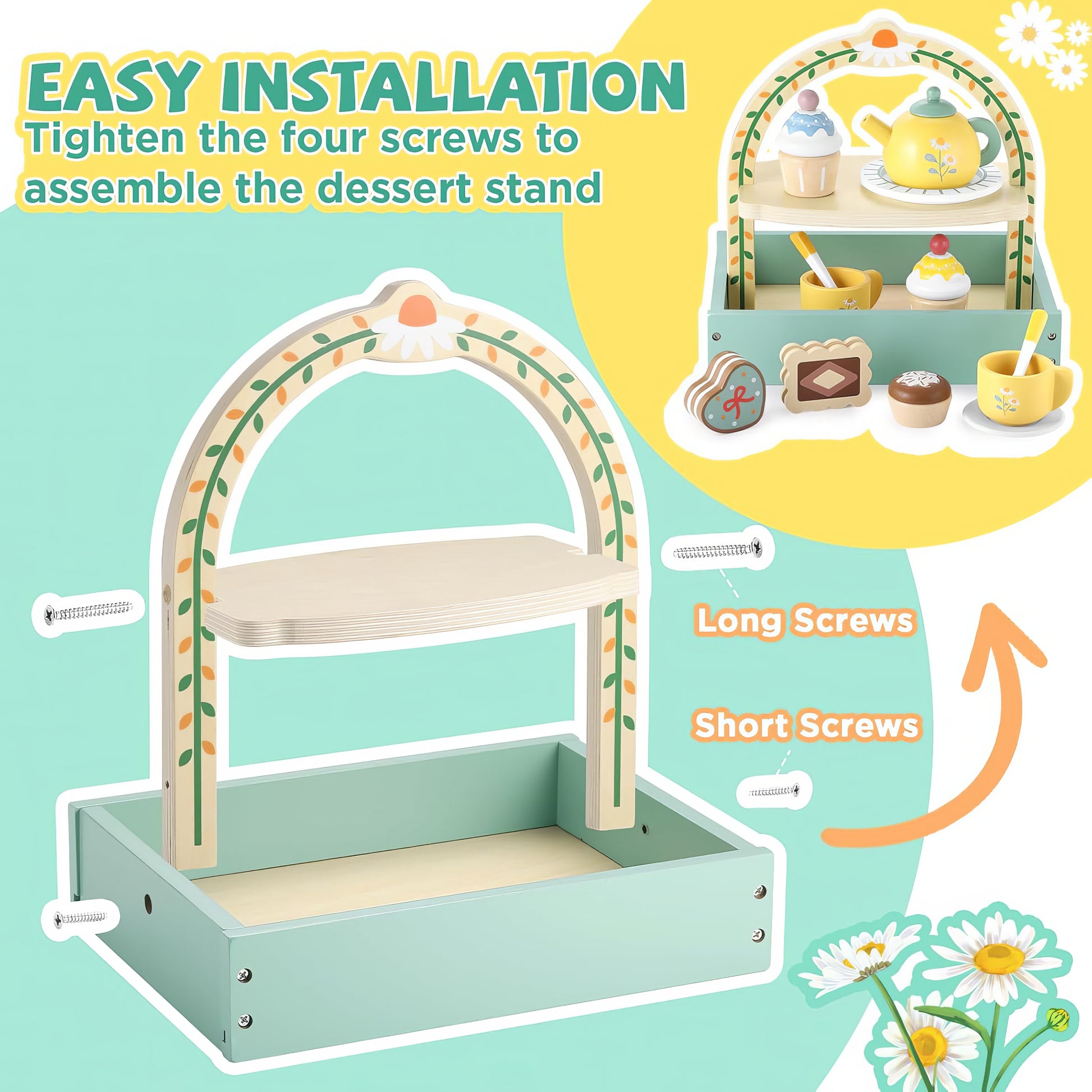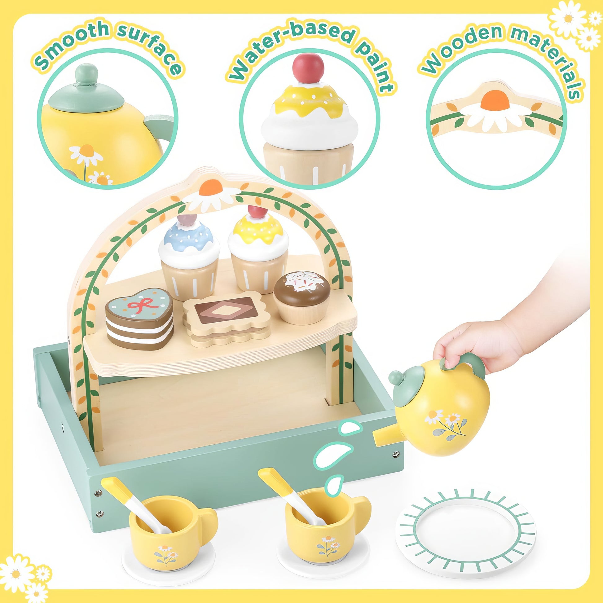 Montessori Standlı Ahşap İkindi Çayı Oyuncak Seti – Eğitici Tatlı ve Çay Servisi