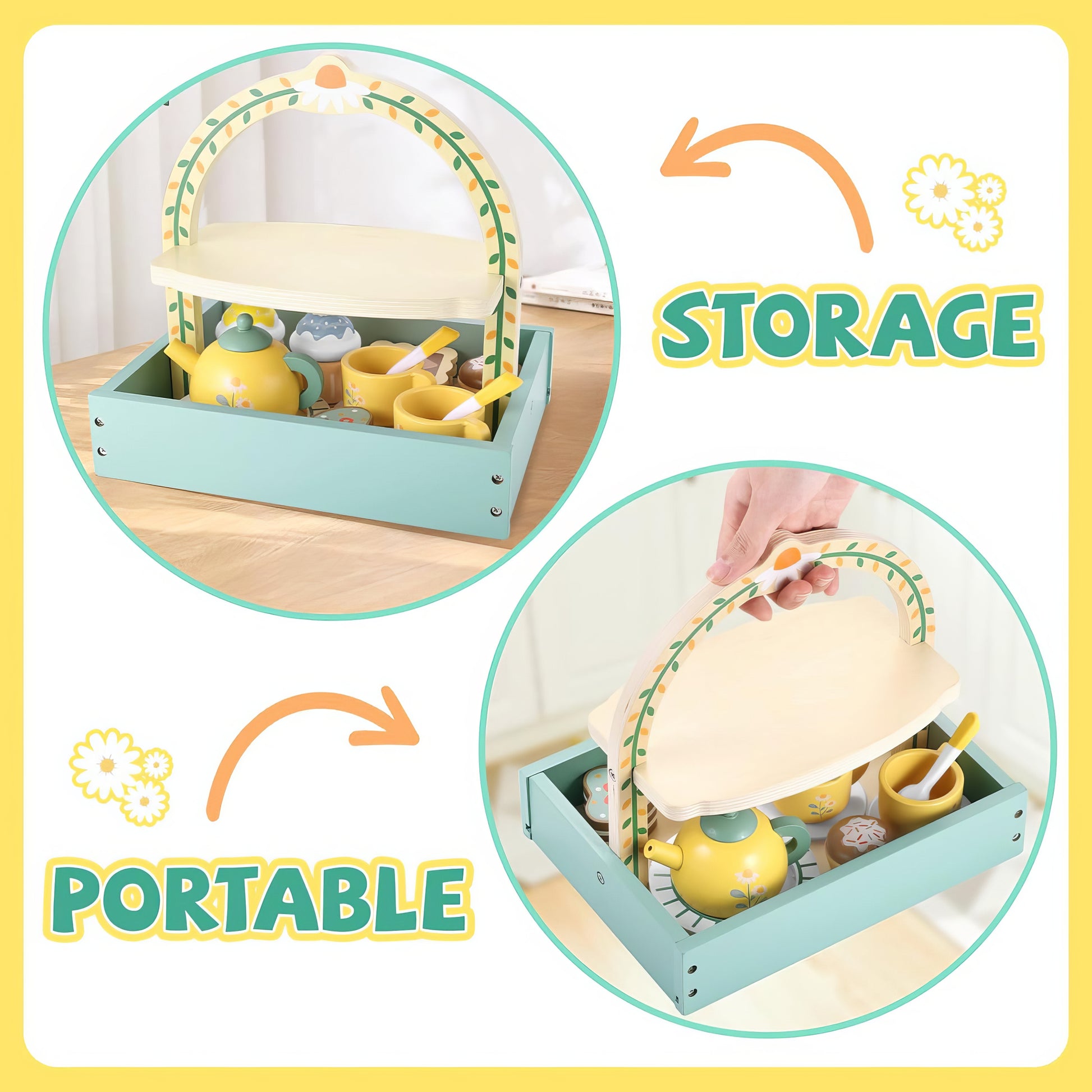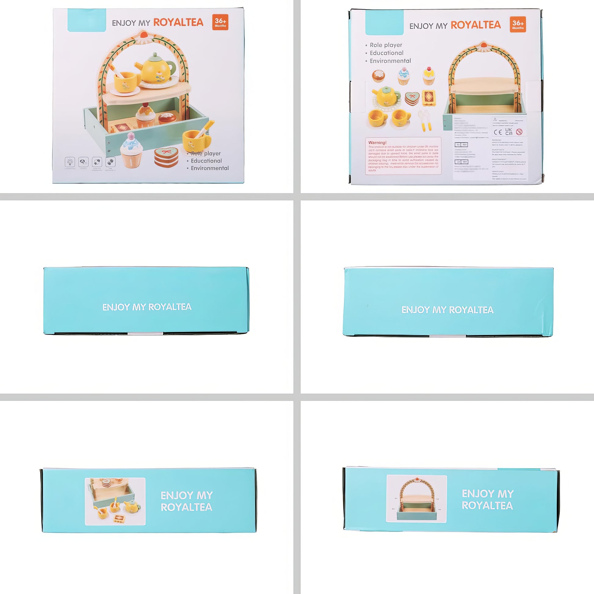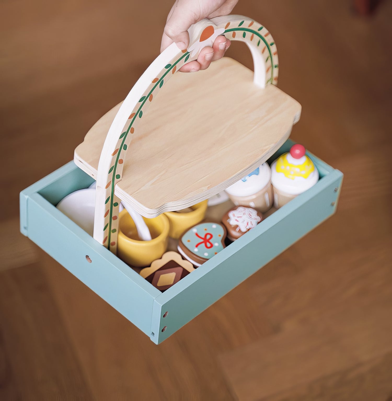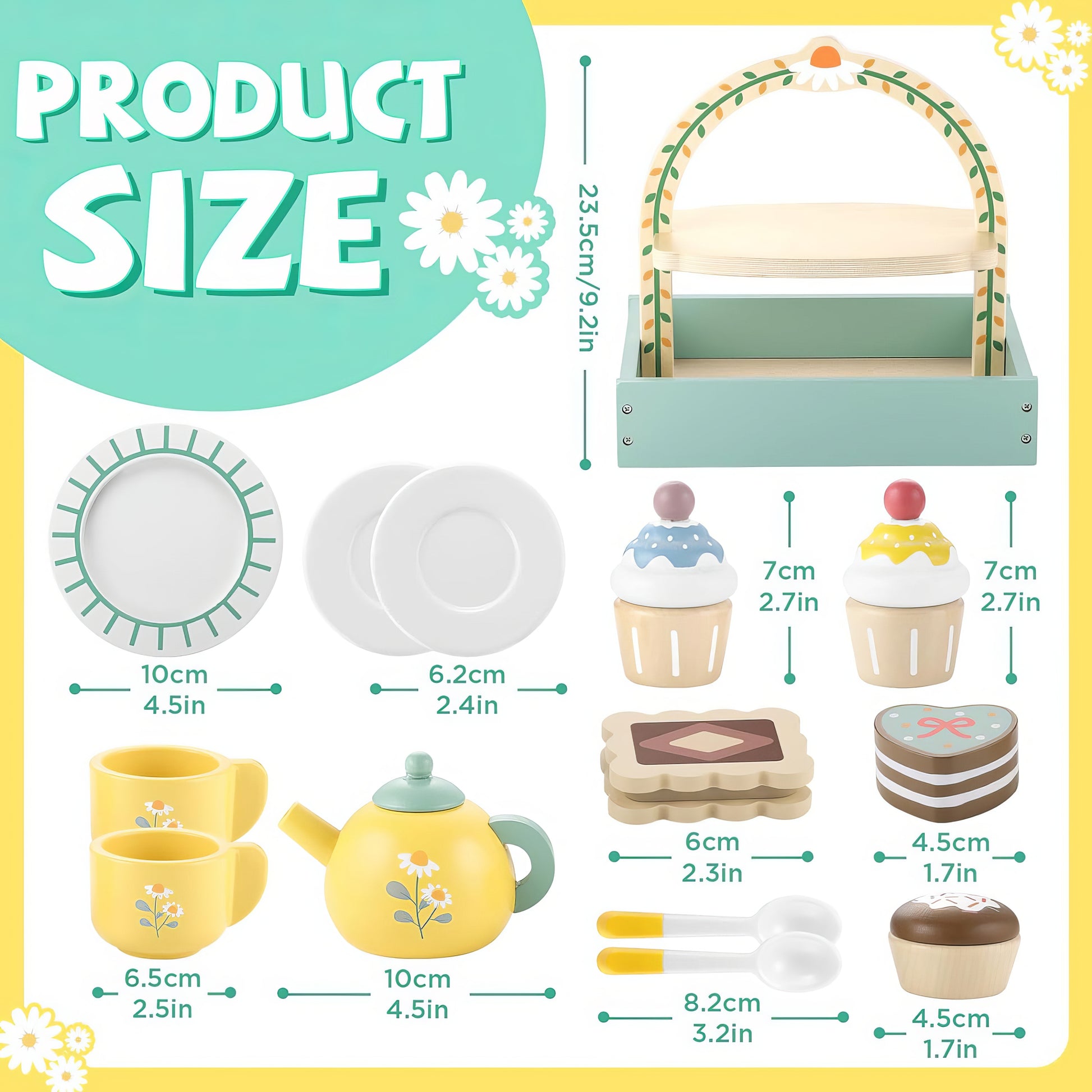 Montessori Standlı Ahşap İkindi Çayı Oyuncak Seti – Eğitici Tatlı ve Çay Servisi