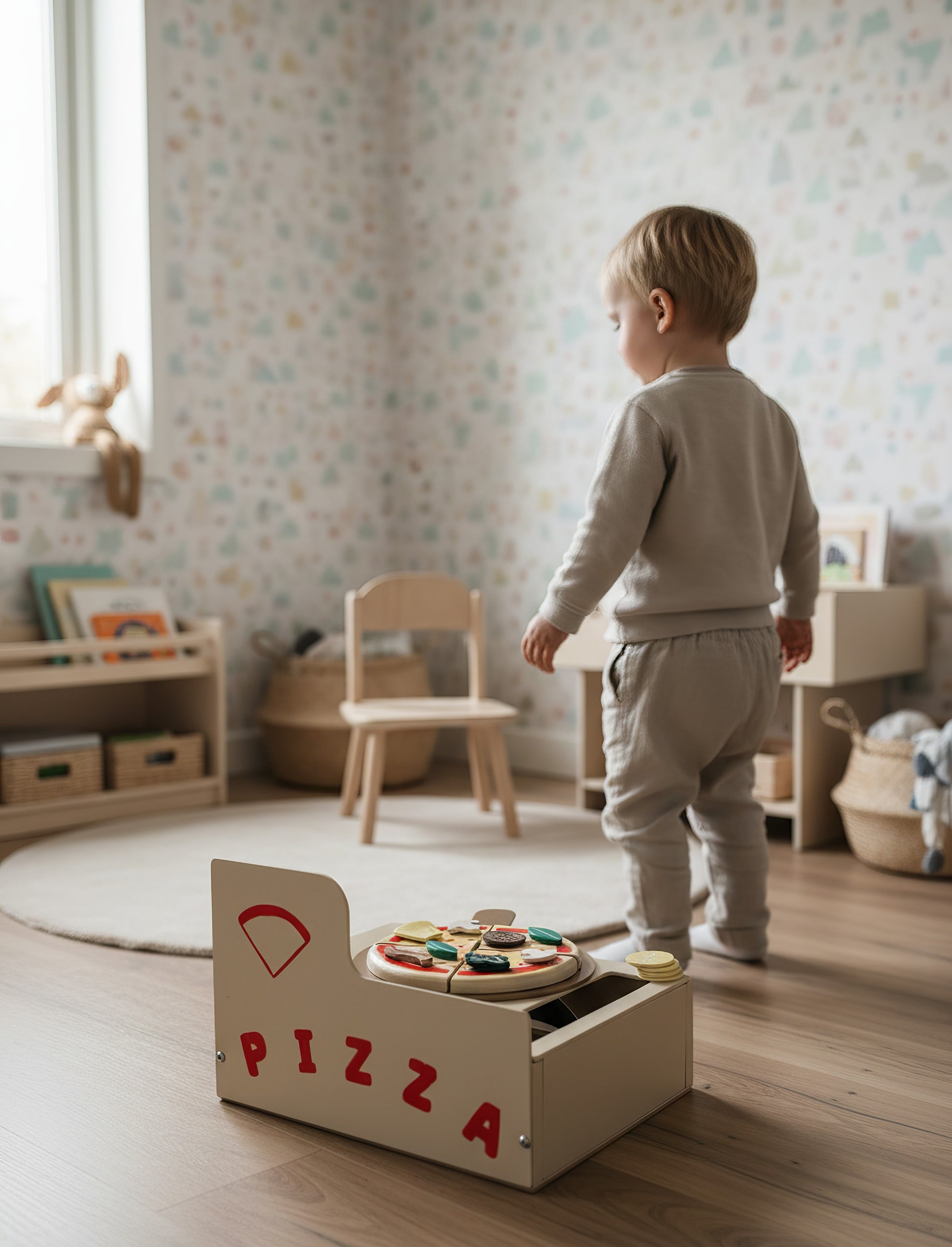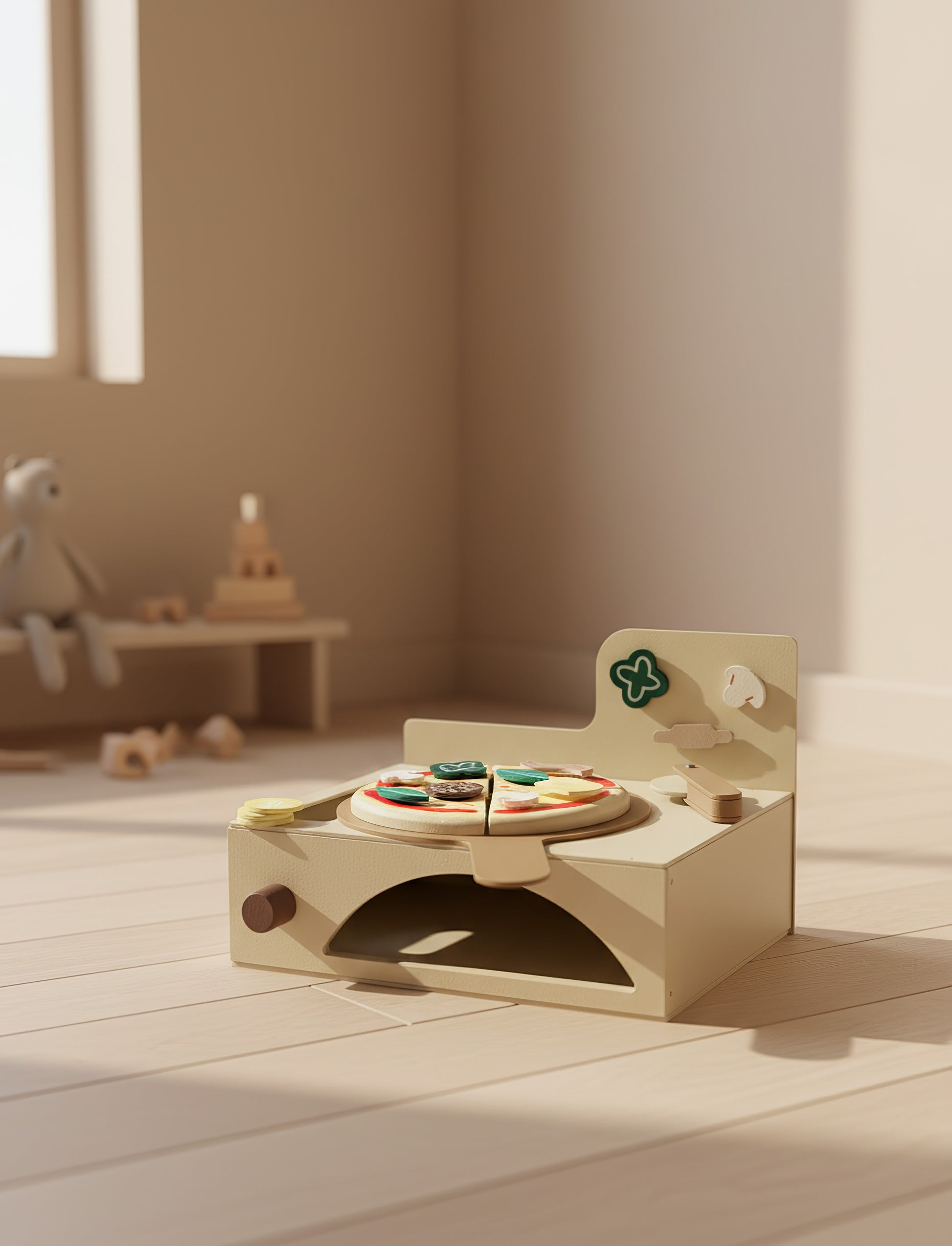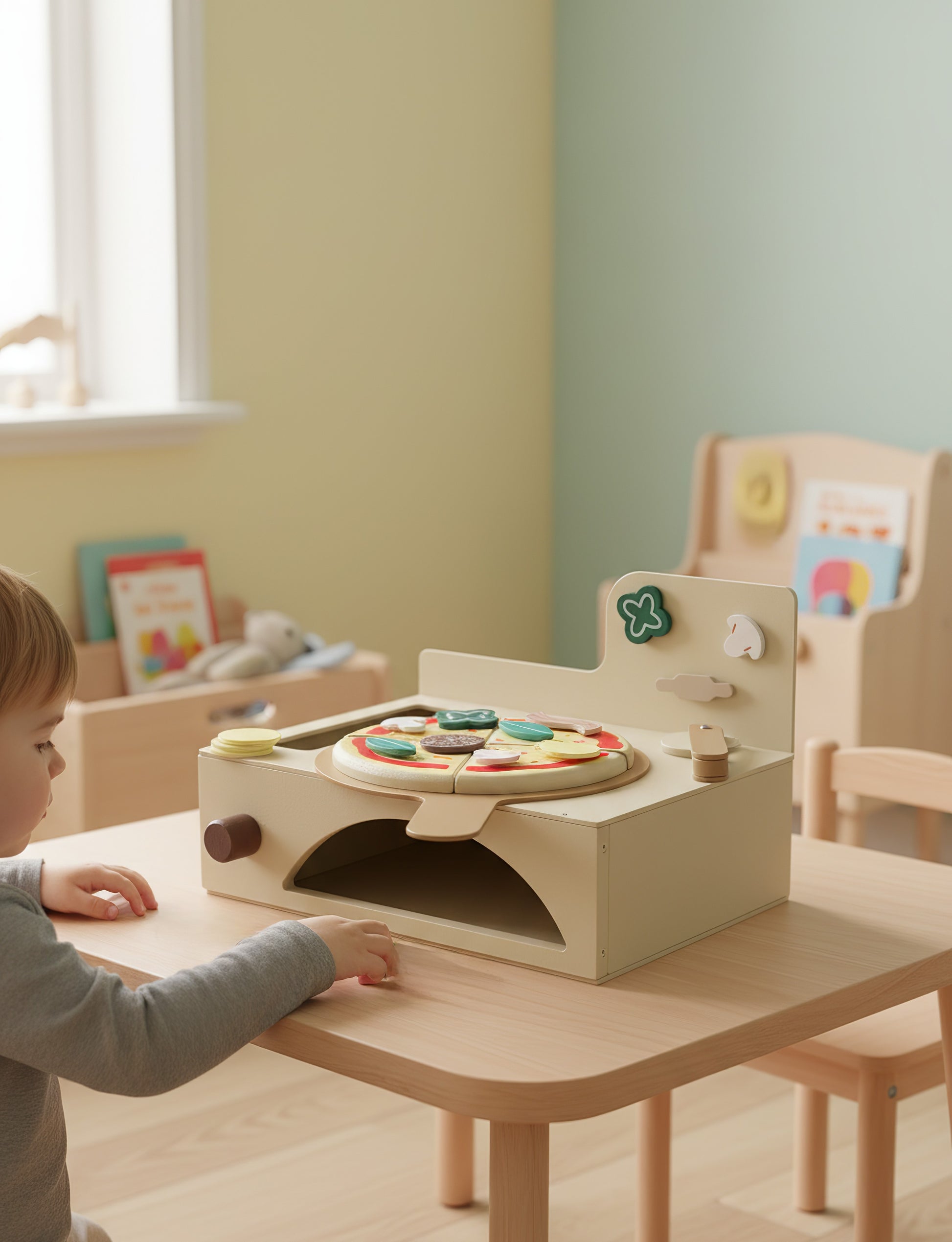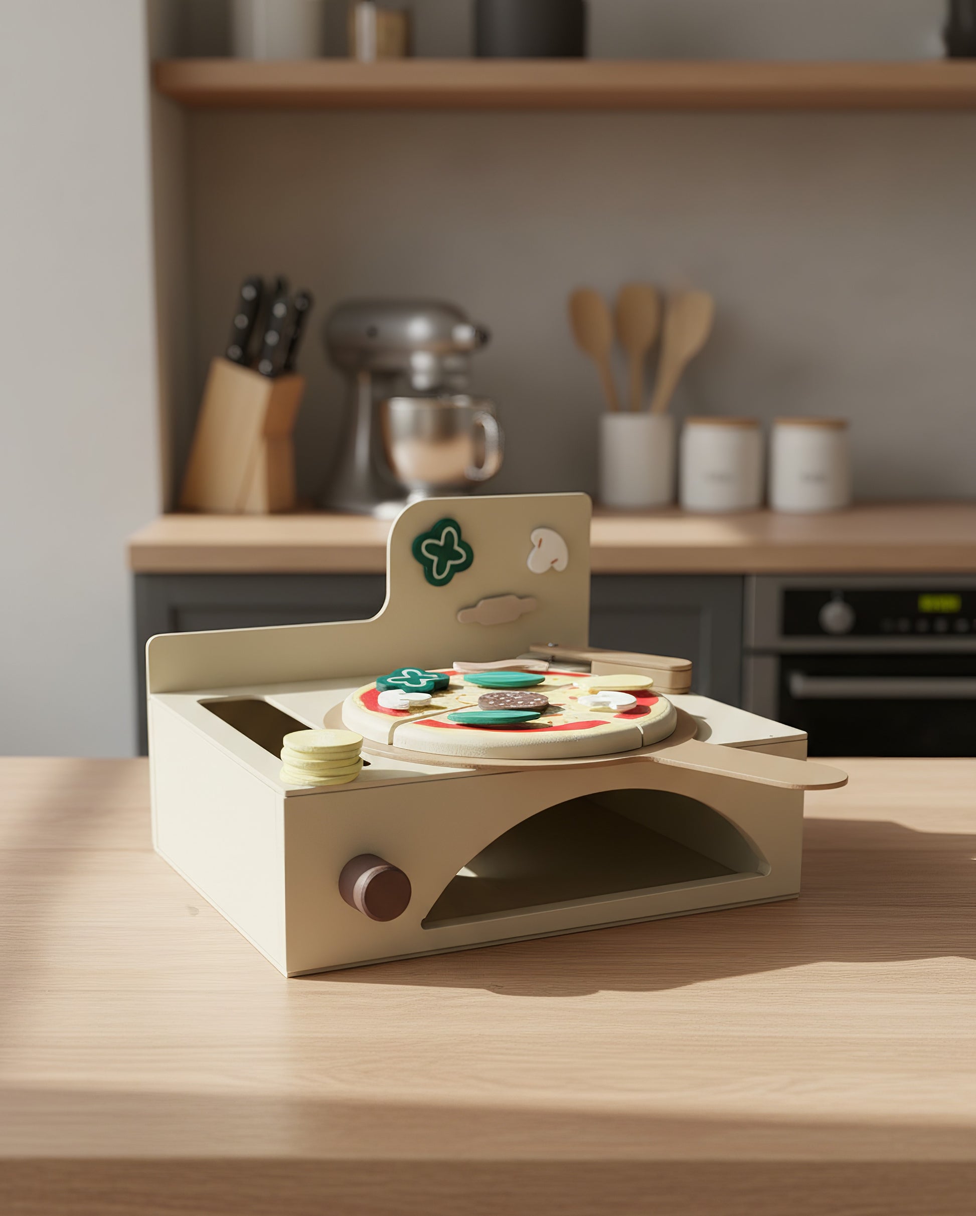 Çocukların hayal gücünü, el becerilerini ve sosyal gelişimlerini destekleyen bu Montessori ilhamlı 13 parçalık ahşap fırınlı pizza seti, hem eğitici hem de eğlenceli bir oyun deneyimi sunar.